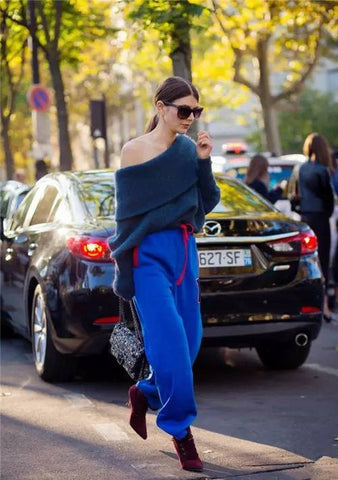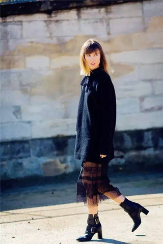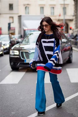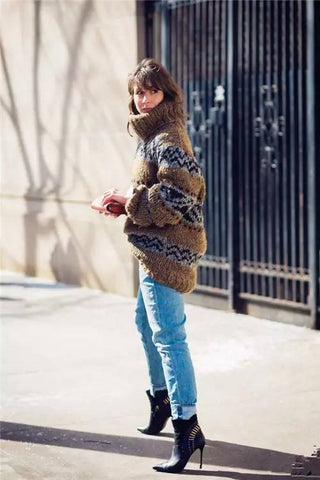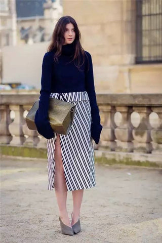 Turtleneck sweater + striped slit skirt + pointed shoes + clutch