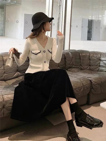 The V-neck knitted cardigan sweater, the self-cultivating V-neck knitted cardigan, chose the classic white style, and the black side line is dotted in the position of the pocket. It is very clean and has a particularly delicate beauty. With a black skirt, it is also high-end and elegant, and this way of wearing it will be more fashionable and slim.
