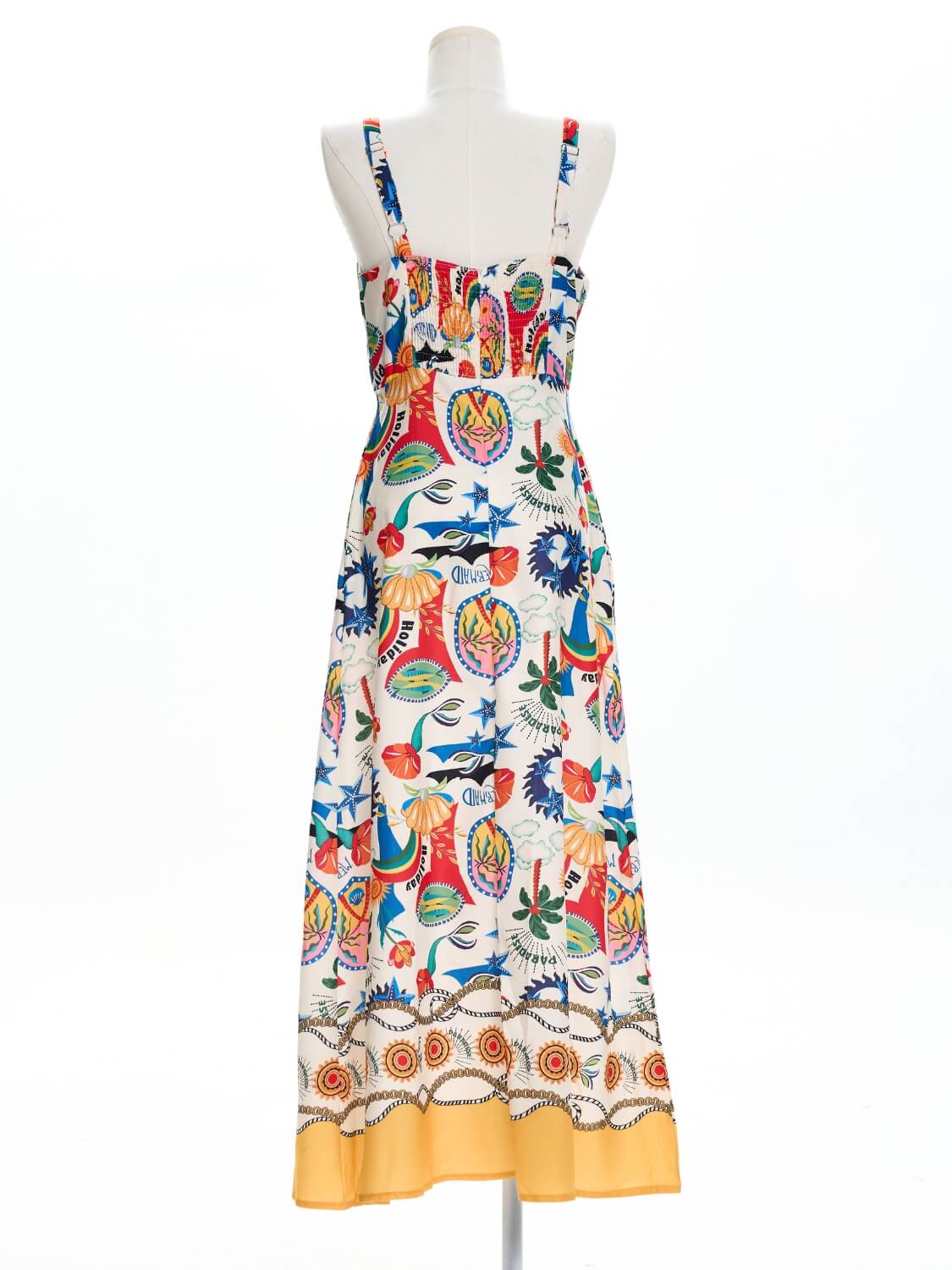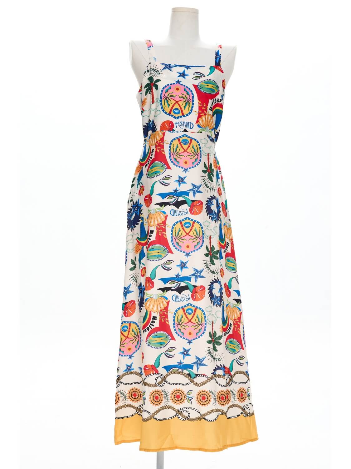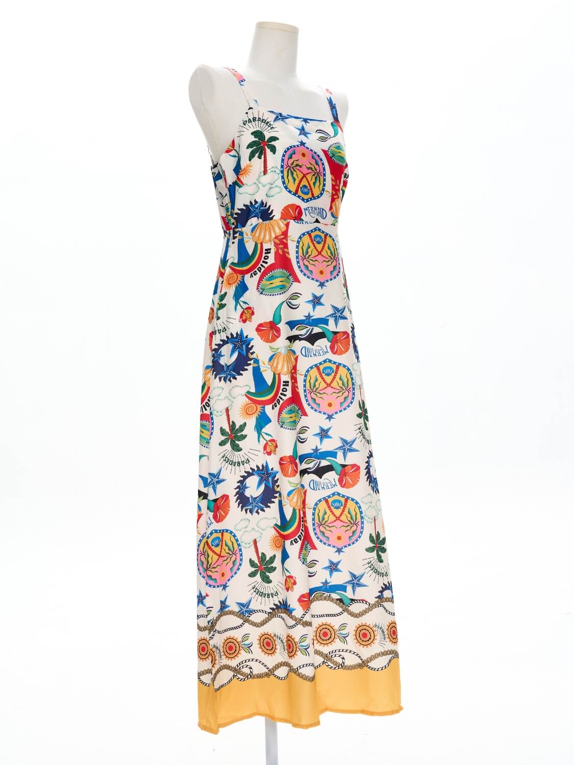 • Feature: Square neckline. Sleeveless. Tropical printed details. Blend linen. Midi length.