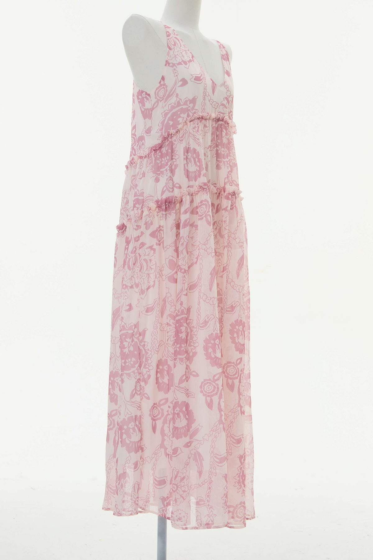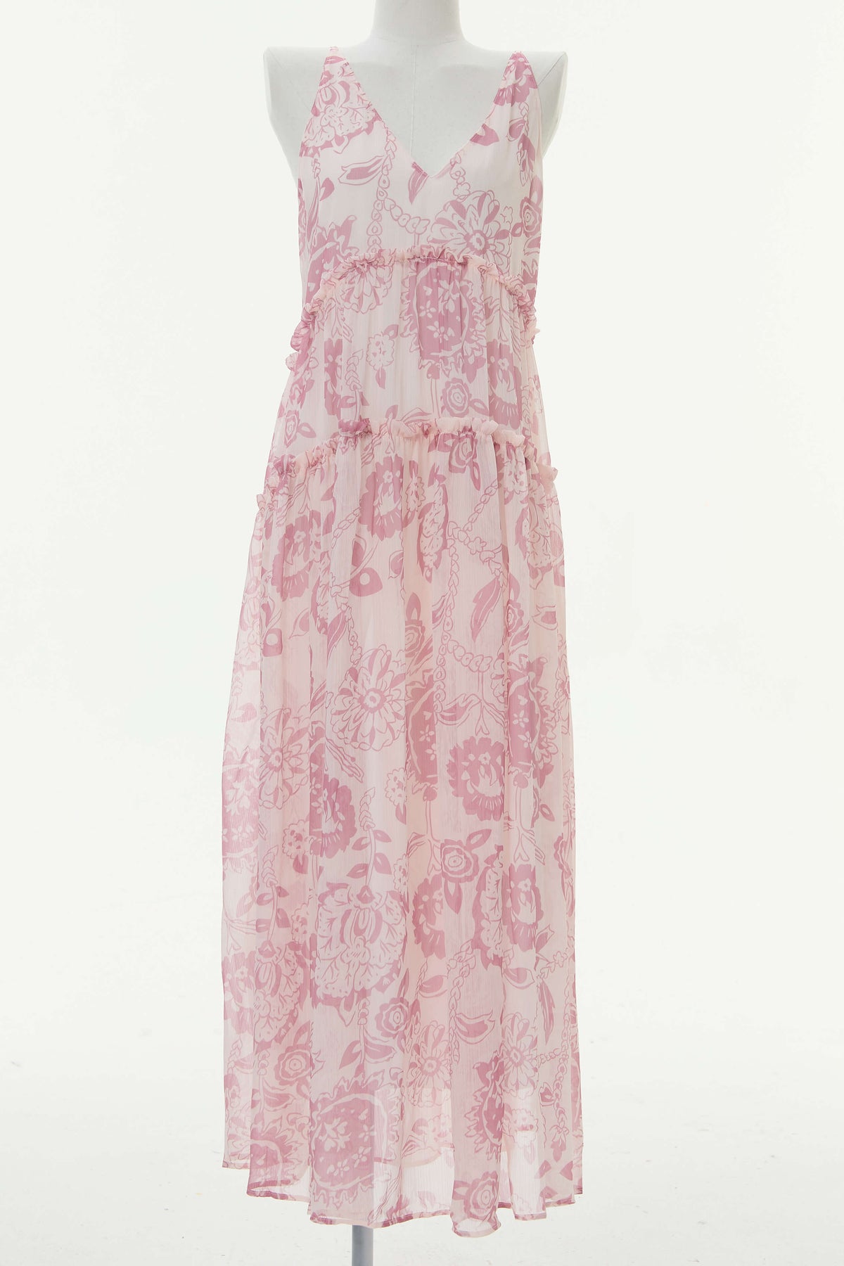 Feature: V-neckline. Sleeveless. Flora printed. Maxi length.