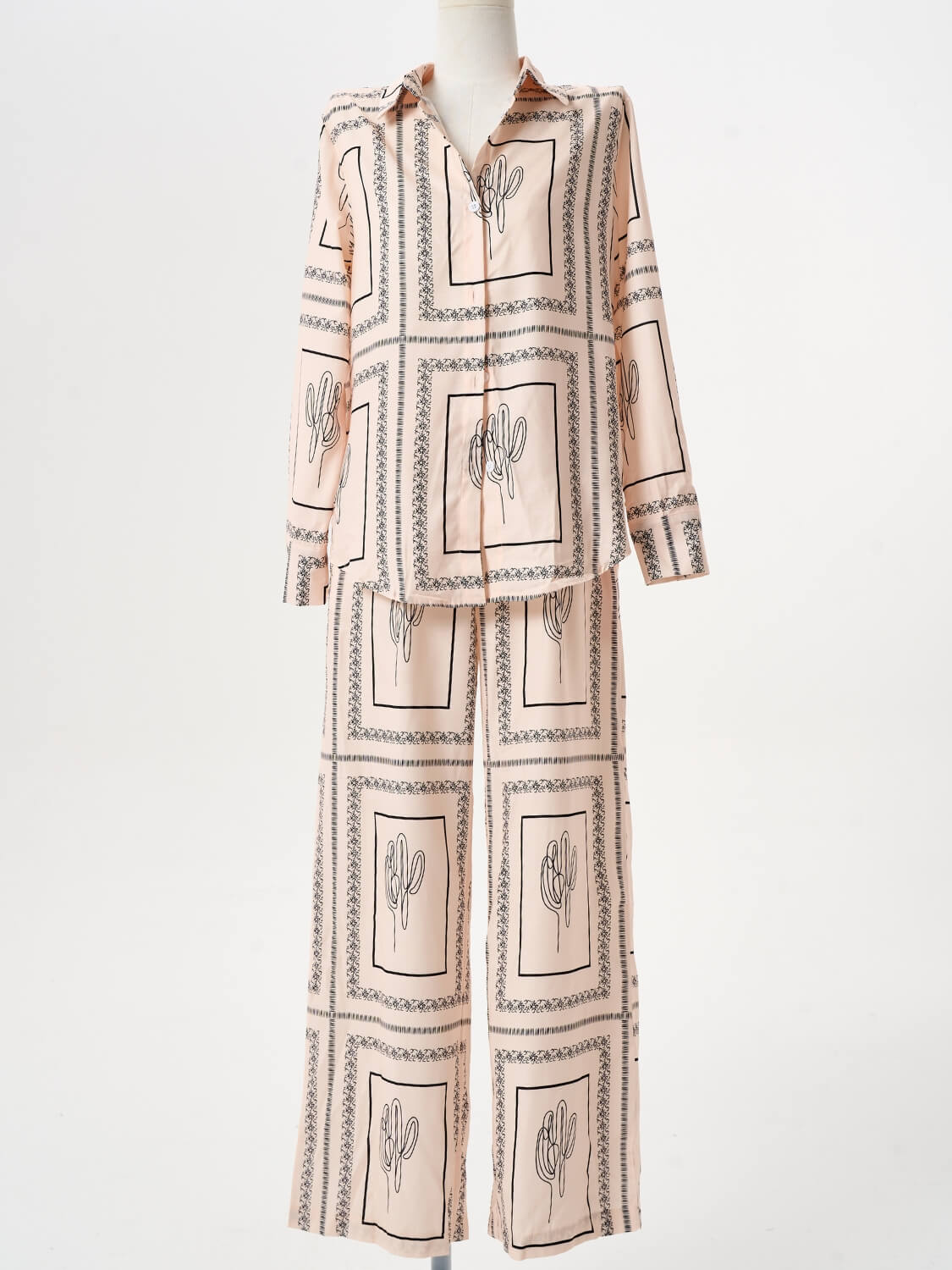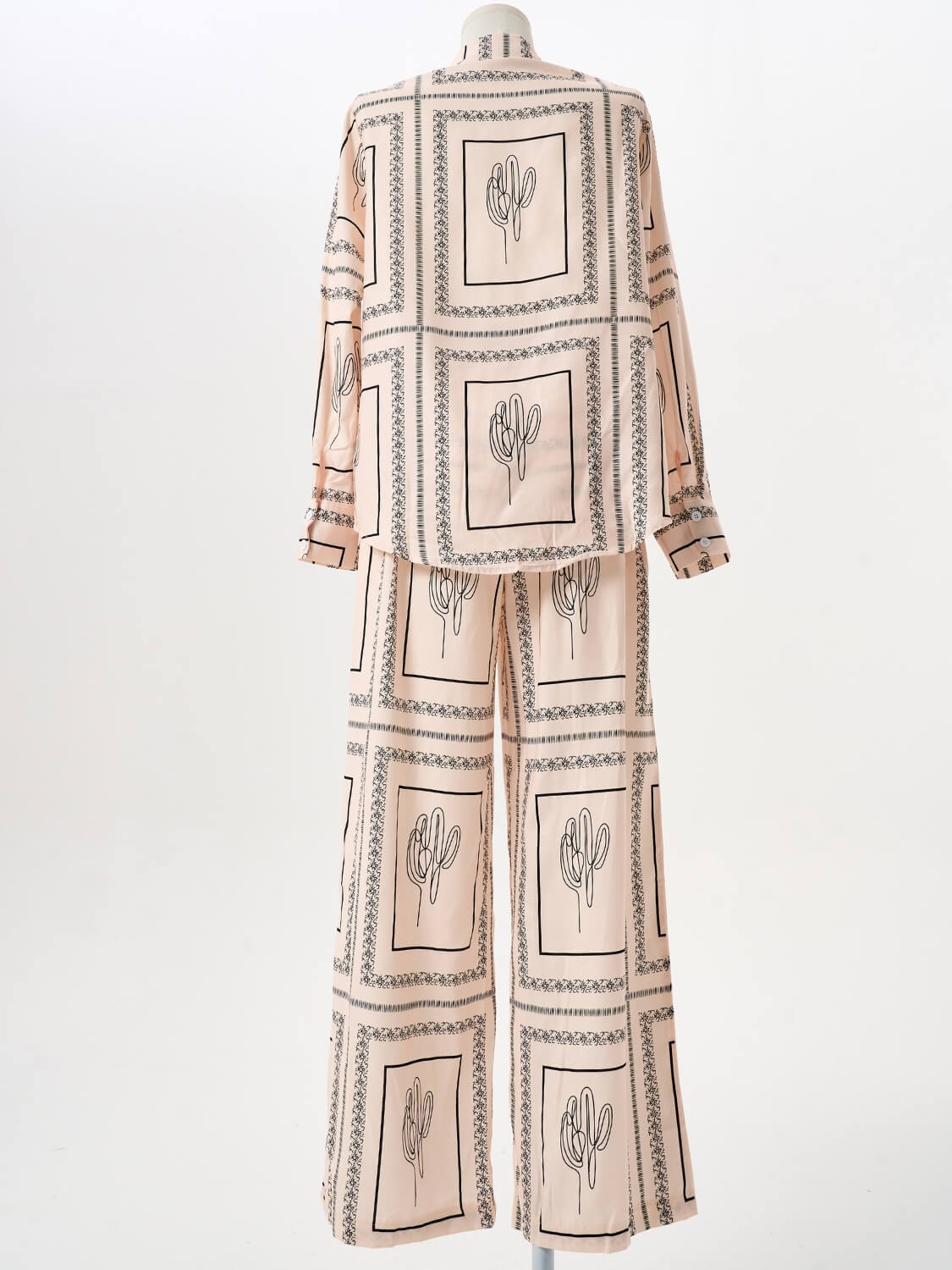 • Feature: Collared long sleeve shirt. Off center front button closure. Wide leg pants. Unlined. Relaxed fit. (1 pcs shirt + 1 pcs pants total 2 pcs in set)