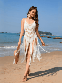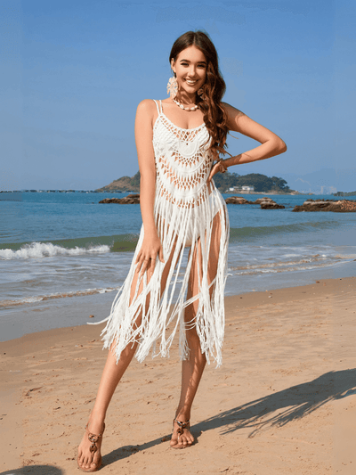 Cover up and stand out with the Caliana Tassel Cover Up Maxi Dress. This white dress features a unique tassel design that will add a playful touch to your beach look. With its flowy and comfortable fit, you'll stay cool while looking stylish at the same time. Perfect for a day at the beach or a pool party, this dress is a must-have for any summer wardrobe. Don't be afraid to show off your fun and quirky side with this dress!