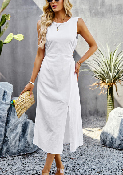 Get ready to stun in this Lunch Date Sleeveless Slit Midi Dress! Made with breathable soft cotton fabrication, this dress features a playful side waist cut-out for a unique and fun twist. Perfect for a lunch date or any occasion, this dress will make you stand out in style.