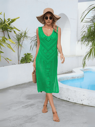 - Key Features: V-neckline. Sleeveless. Side slits. Crochet. Midi length. Relaxed fit. Not Lined.