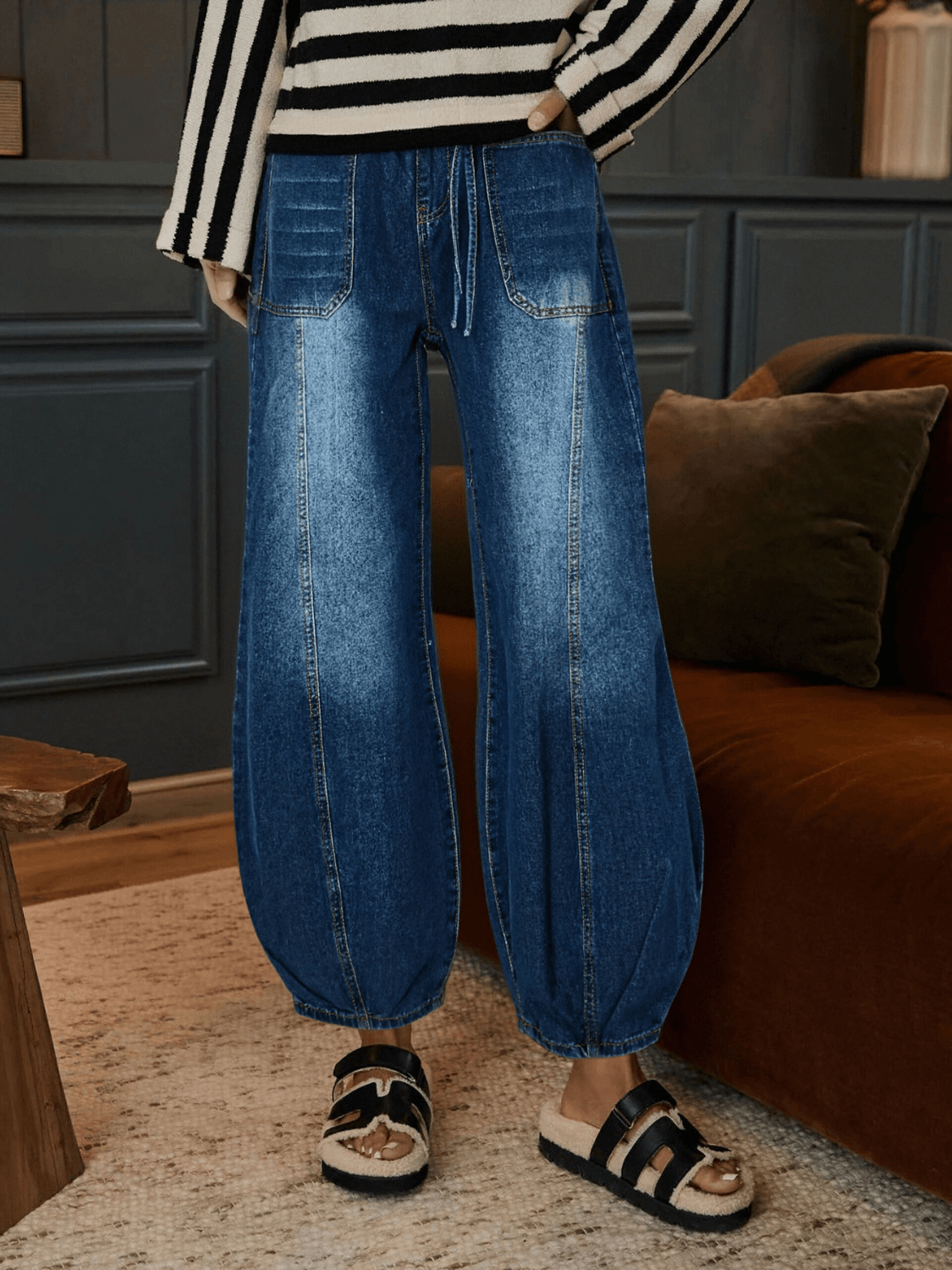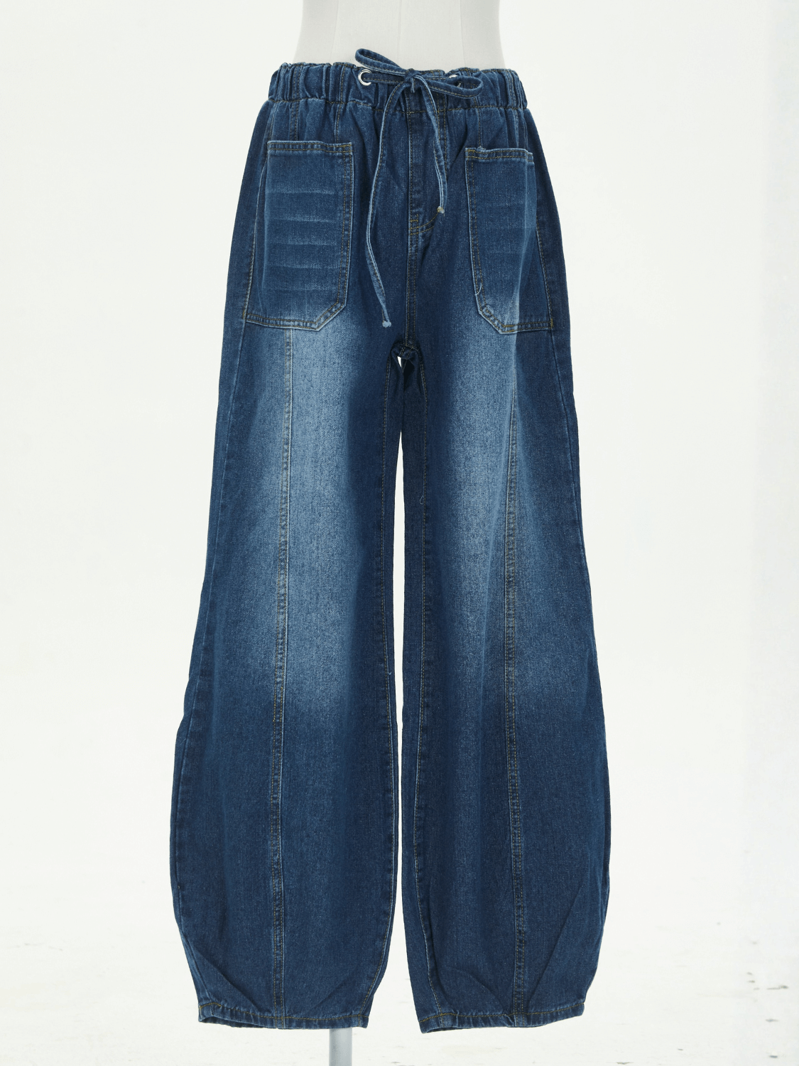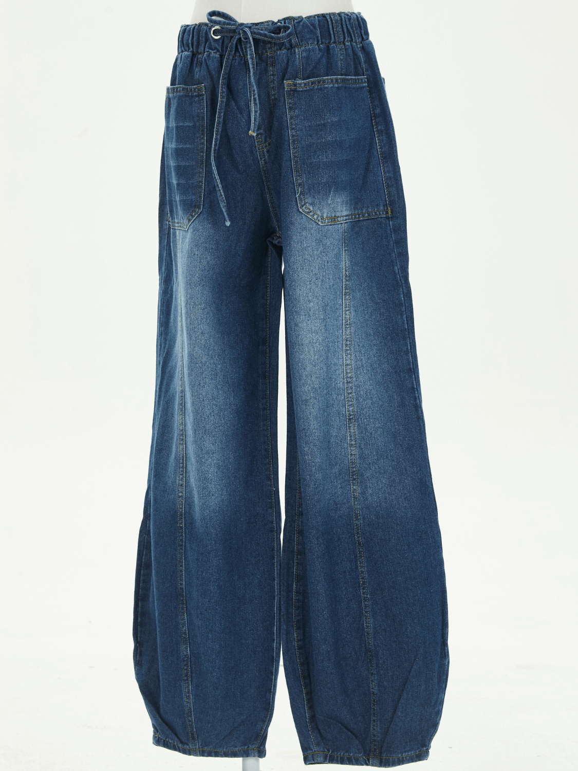 • Feature: Mid-rise. Wide leg fit. 4 Classic Pockets. Light Wash Denim Fabric. Front Tie Closure. Relaxed Fit.