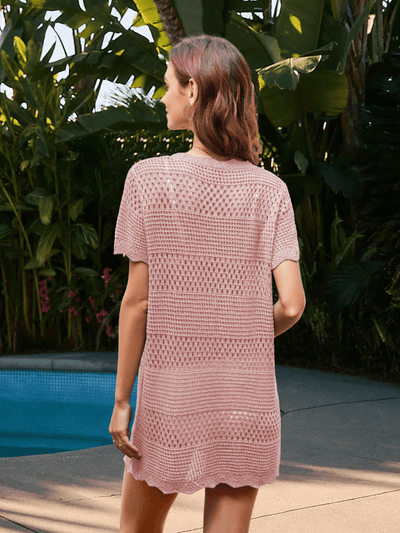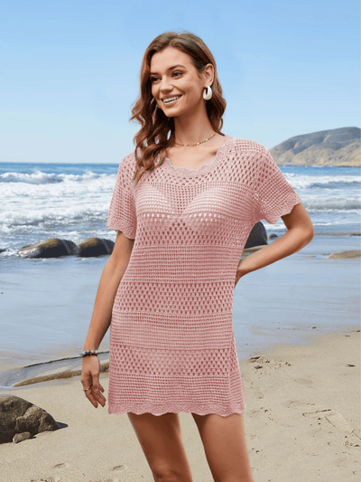 • Feature: Scallop Neckline. Short sleeves. Crochet knit fabrication. Mini Length. Relax Fit. Scallop hem. Not Lined.